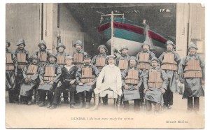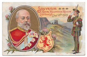 The four cards shown on this page, from our members’ collections, all have some association to our local area. But they also illustrate other collecting themes as well. At above left, this card commemorates the Royal Volunteer Review of 1905 held in Edinburgh, but also touches on royalty and militaria as subject matter. Above right, the card shows an old image of the lifeboat crew at Dunbar, East Lothian, featuring a nautical topic and social history.