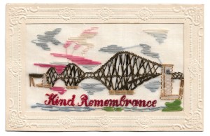 Meanwhile below left, this “real photo” postcard shows the aftermath of a fire in Penicuik, Midlothian, and again is an example of social history. Finally, below right, this card shows the Forth Bridge, in historical West Lothian, but is also an example of a WW1 “silk” and related to railways.