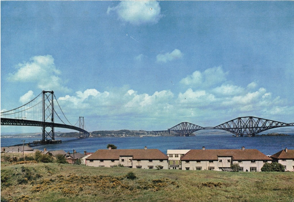 SCOTLAND : The Forth Bridges from South Queensferry, West Lothian. With the erection of the new Forth Road Bridge, opened 1964, the view above South Queensferry shows two of the most remarkable bridges in the world. Although contrasted in design, each is a fine example of combining strength with grace.